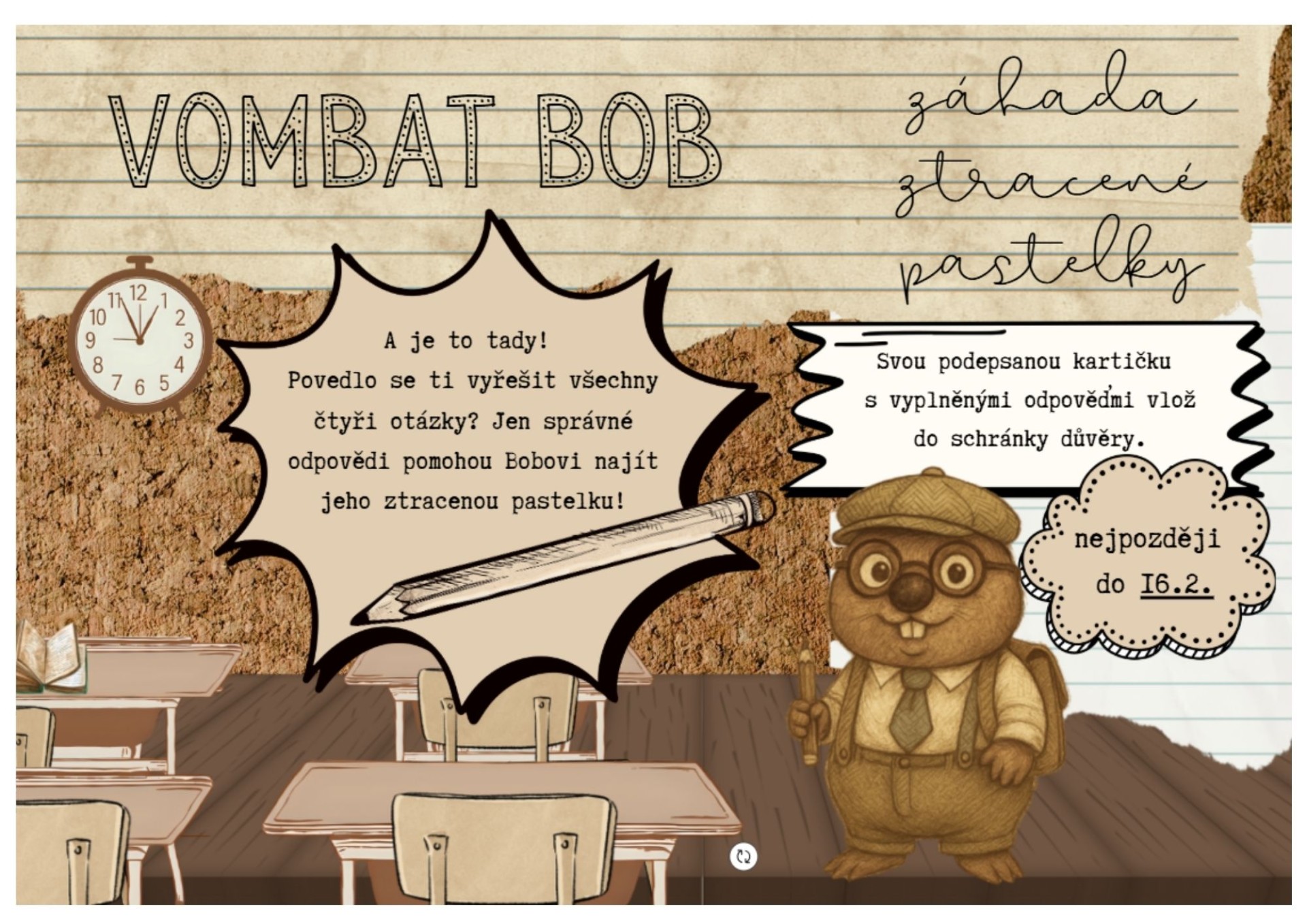 Naše oblíbená celoškolní hra Vombat Bob se vrací! Tentokrát se vydáme na cestu do hlubin historie škol. Čekají vás nové otázky, úkoly a zábavné výzvy, které prověří vaše znalosti i postřeh.